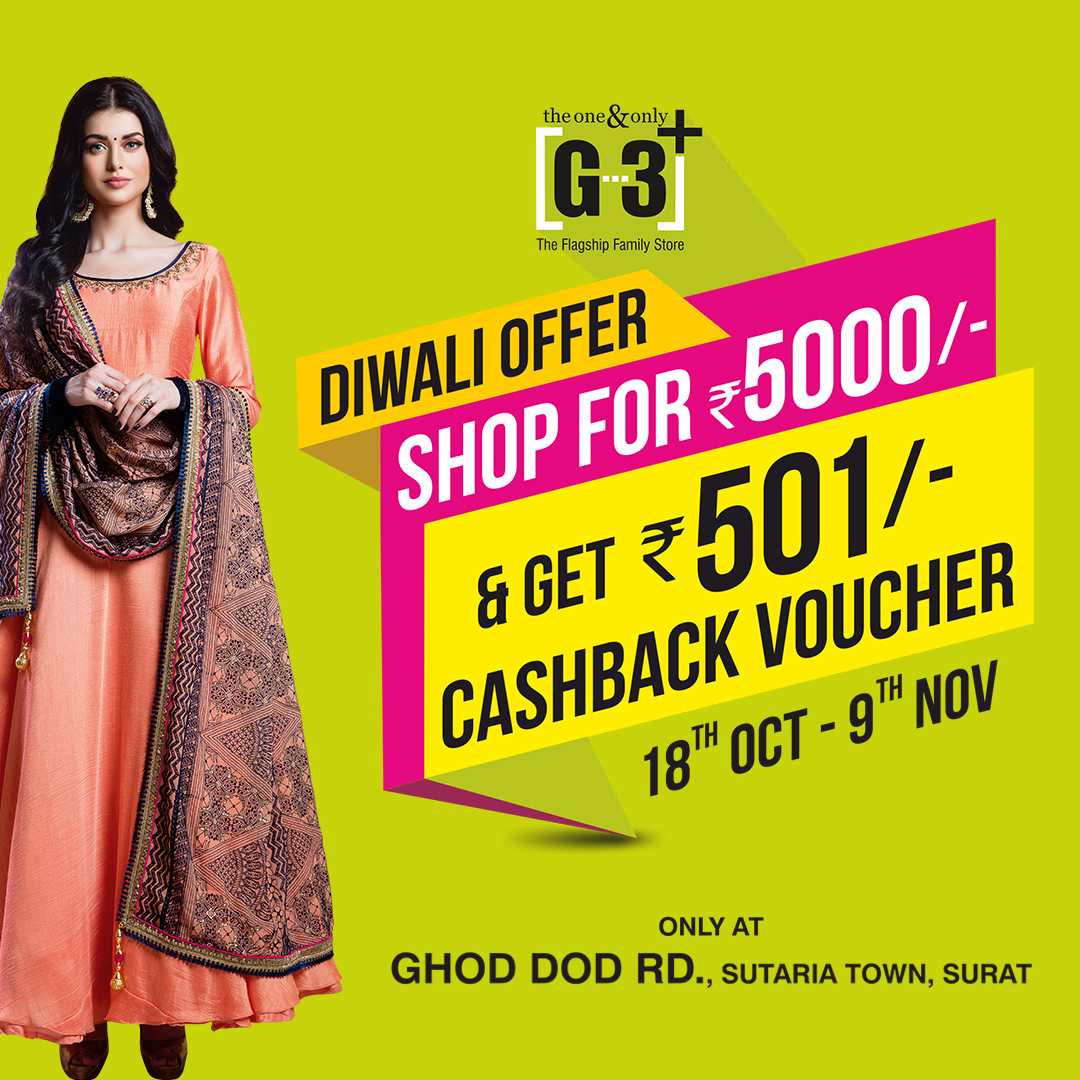 Let’s Celebrate Diwali with Shopping at G3+ Ghoddod Rd Sutaria Town Store, Surat. It’s time to Save for Festive Season with INR 501 Cash Back … Read more