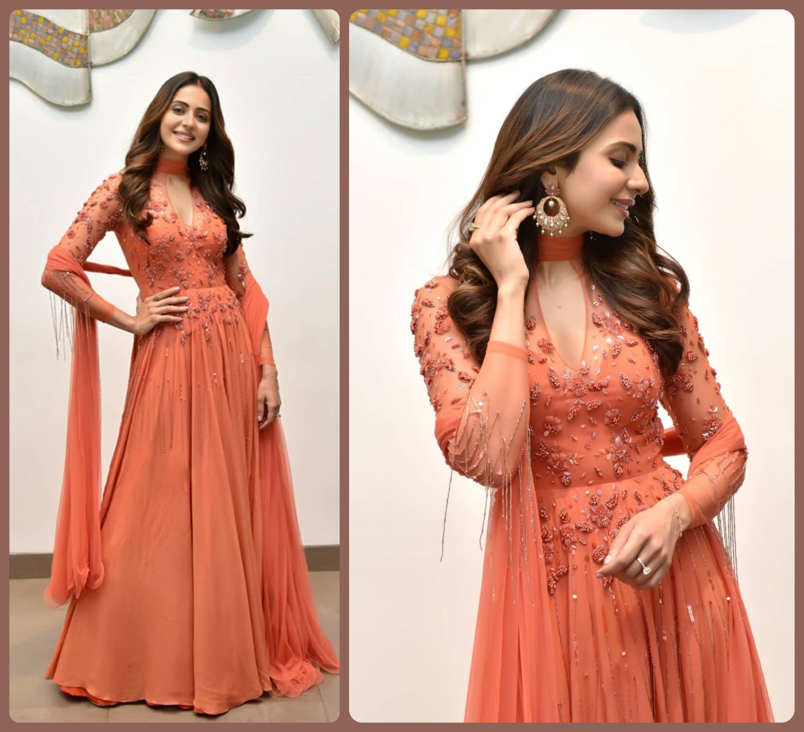 For a more traditional look, Rakul Preet’s orange Anarkali is ideal. Shloka Khialani’s full net-sleeved plunging neckline floor-length A-line Anarkali will make your festive day even more special with its heavy embroidery.