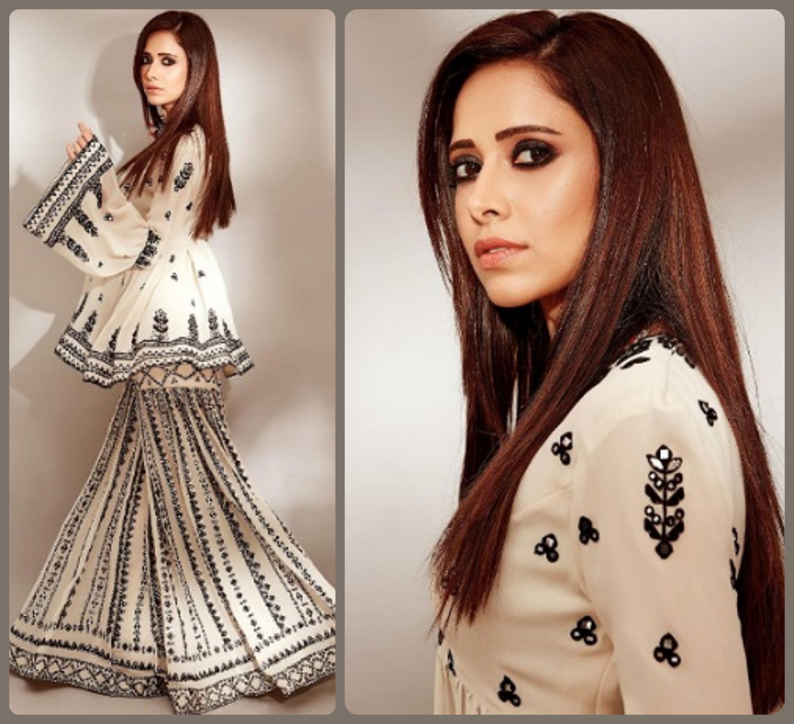 Her white peplum top embellish with mirrors, and she wore Sharara pants. Nushrat accessorizes her look with an oxidized silver choker, which complements her smokey eye look and simple yet elegant makeup. Thus, the entire look is pristine and spotless.