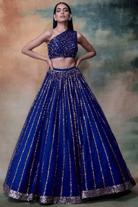 If you are looking for the classy, rich, and elegant fabric of lehenga then choose a handwoven banarasi silk lehenga choli with a complemented navy blue one shoulder crop top blouse. It will make you look more elegant, sober, glamours and a stunner.