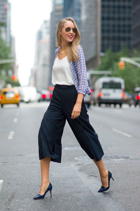 Now, give yourself an extravagant look by pairing your black culottes with a plain white top and shrug. You can pick this style for a casual hangout. However, you can find various types of long and short shrug in different designs. Here, a white camisole top is a great choice to combine with your black pants along with a shrug. Moreover, add some accessories like earrings, aviator sunglasses, pointed heels, and you’re all ready to go.