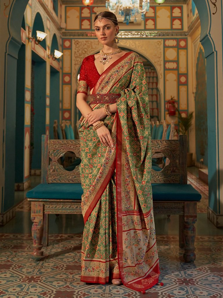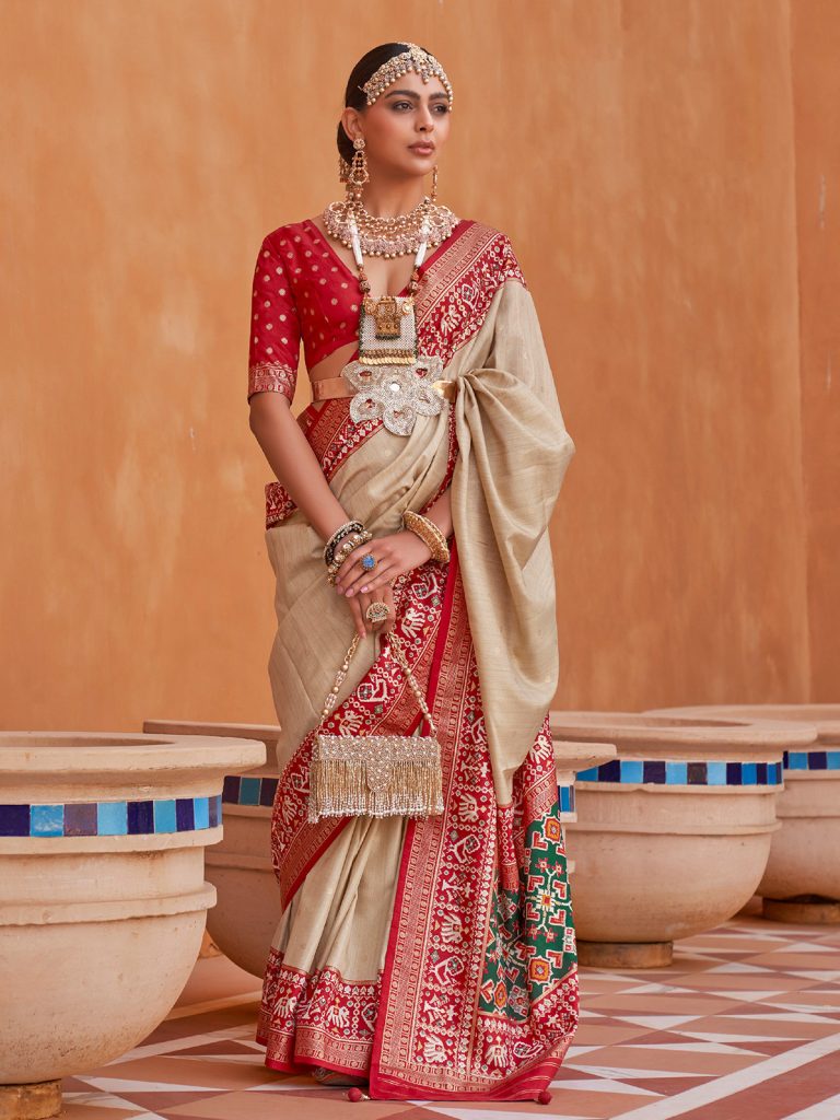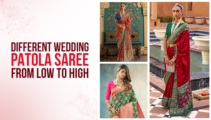 Let’s take a look at some interesting wedding sarees in patola ikat art weaving. Patola sarees come in various subtypes such as Rajkoti Patola, Hyderabadi Patola, Patan Patola, Tissue Patola Saree, Handwork Wedding Patola Saree, Bridal Handloom Patola Saree, Tissue Pure Patola Silk Saree, and the Embellished Wedding Patola Saree.
