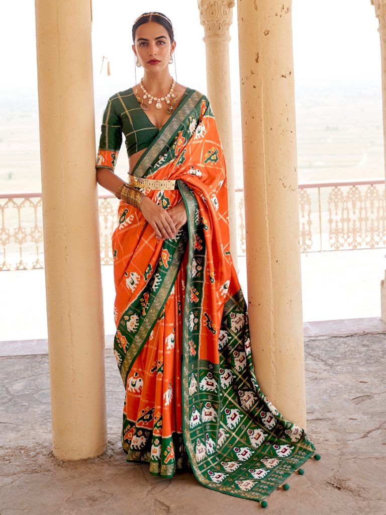 Inspired by the opulence of the Nizams, Hyderabadi Patola sarees are a fusion of traditional Patola weaving with Persian influences. The intricate zari work and ornate designs define the Hyderabadi Patola, which often features motifs like paisleys, flowers, and elephants. These sarees exude a regal aura, making them a preferred choice for weddings and grand celebrations.