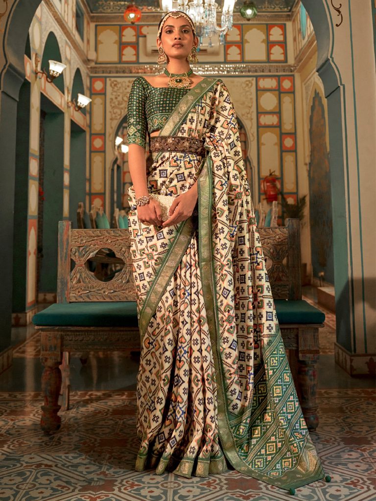 Rajkoti Patola, hailing from the vibrant state of Gujarat, presents a kaleidoscope of colors woven intricately into geometric patterns. Known for their double ikat technique, where both warp and weft threads are resist-dyed before weaving, Rajkoti Patola sarees exude symmetrical elegance. The harmonious amalgamation of hues and patterns in each Rajkoti Patola shows stories of traditional craftsmanship, making these sarees look more cultural.