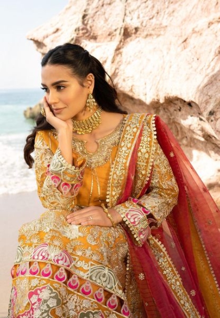 While this one is for the women who enjoy wearing suits, we prefer to attempt something different with a gharara pair. It’ll be soft, breathable, and stylish. This one is featured with gold thread, zari, sequins, beads work with the perals all over the suit.