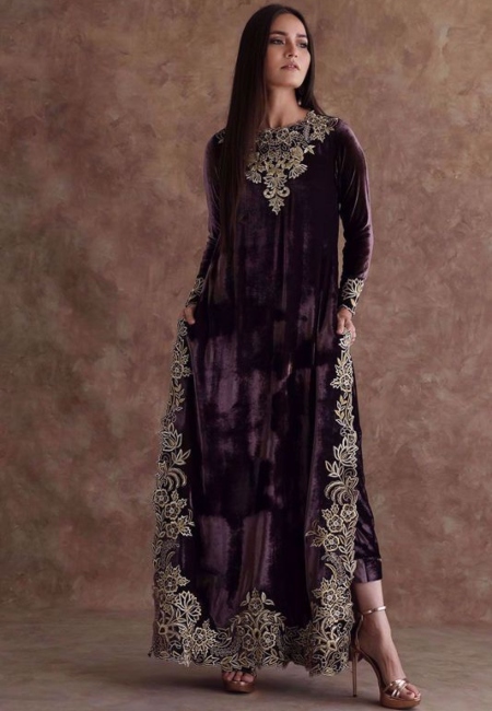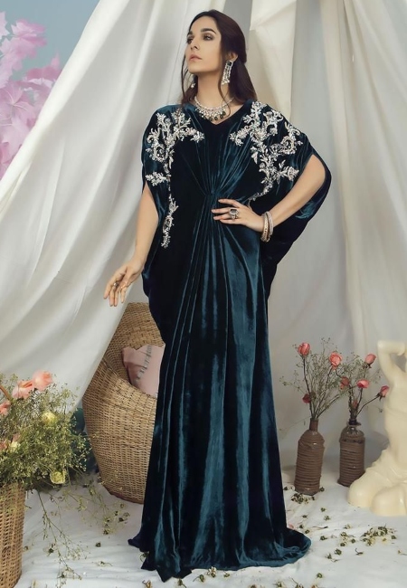 Navy blue designer velvet gown for the woman who is looking for the magnificent outfit to don herself well in a simple way. You can choose a simple velvet gown or else go for the heavily worked gown to complement your whole look. Also, we suggested you go for the natural makeup on it so that your outfit will highlight.