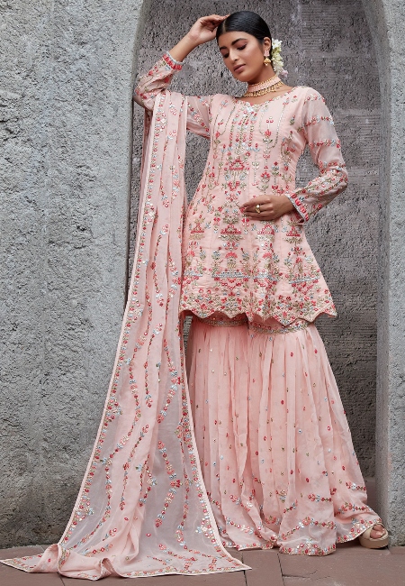 A sharara is another time-honored piece. When you wear a proper selection, it will be a one-of-a-kind addition to your wardrobe and will make you stand out from the crowd! Start your search with this Pearl pink sharara salwar combo.
