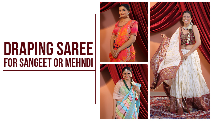 Many ladies would choose a basic, lovely saree draping for mehendi, but nowadays, young women also appreciate wearing saree in a more fashionable approach. As a result, we’ve provided two outfit options for mehendi saree styles and lehenga saree for sangeet. It’s important to choose the right sarees for the drape style and the occasion.