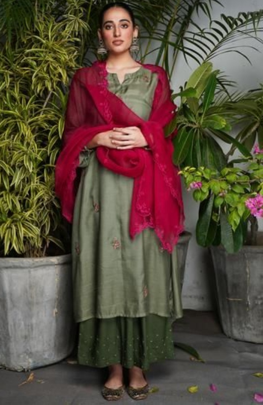 Here is the olive green that is perfectly paired with creamish white palazzo pants to keep it low-key. This type of palazzo Kurta suit looks more elegant with a golden sequins work and a thread work over all the Kurta suit. It looks more stunning when paired with a cream floral organza dupatta.