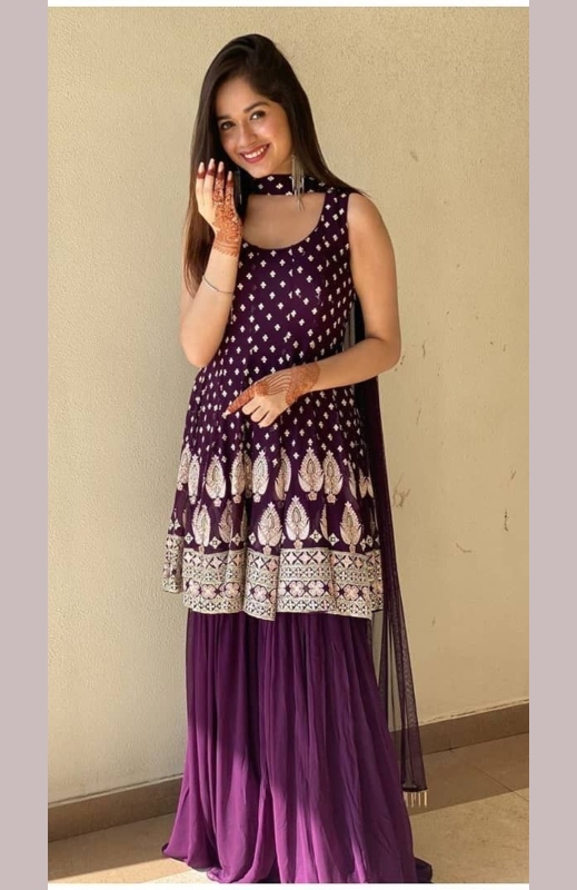 As we all know that the purple color is the most trending one nowadays. Here is the youth sensation Jannat Zubair style herself in this designer purple fully flared palazzo salwar kameez on eid function. This type of style will surely give you an extravagantly look. Especially the white thread work.