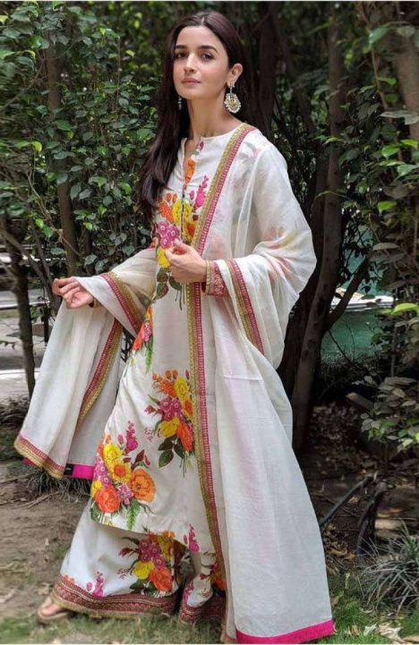 This one is ideal for festivals. The Kurta wear features a Rajasthani Bandhani print with some of the golden touch and go-to work. The palazzo is made out of rayon fabric with Gota embroidery. Get yourself a stunning style of palazzo suit inspired by Alia Bhatt’s look.