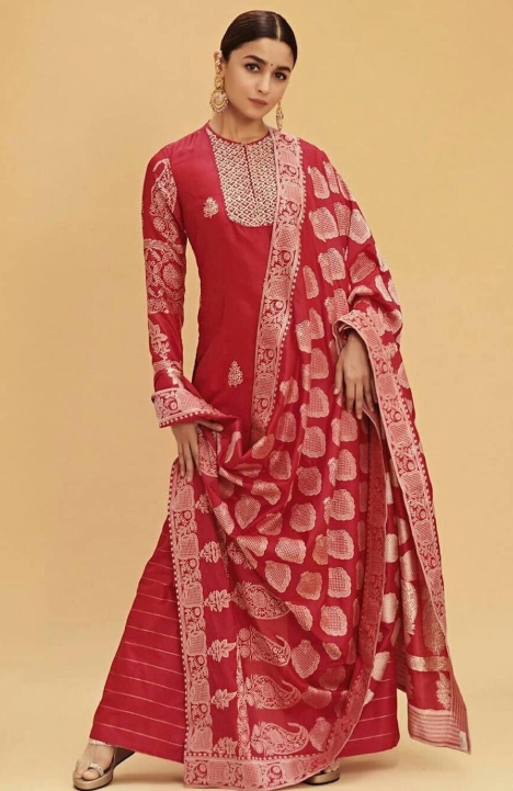 Here is the Aila Bhatt, who always style on point. She slays in the Sabyasachi’s designer red palazzo suit for one of her events and yeah Alia sets fire with her this look. So, Get ready yourself in this designer red salwar suit for your upcoming wedding events and look like her.