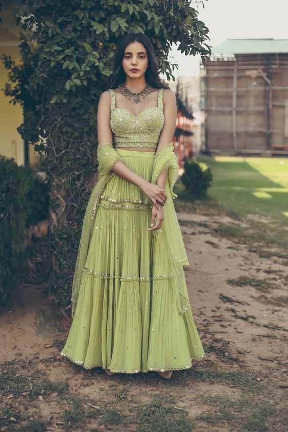 Many stylish bridesmaids choose the contemporary lehengas that are made from georgette fabric. Georgette lehenga is light weighted and gives a good flare. Even the gathered pattern looks subtle in this. Also, draped style, layered style, or tiered pattern gives the stunning look.