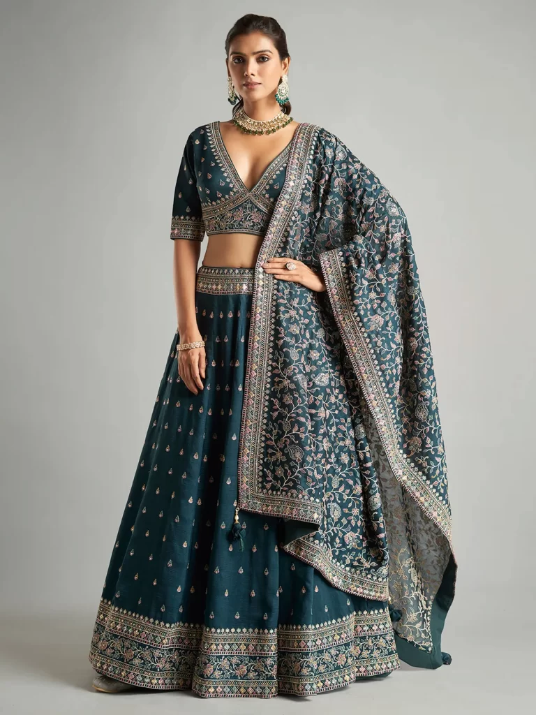 • Some interesting themes of motifs of krishna, figure motifs, animal motifs in lehenga, dupatta or choli are seen more for brides to style statement contemporary outfits for bride.