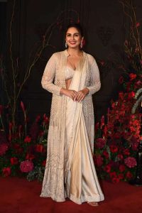 Actresses like Huma Qureshi wore a Cream Saree with a long trail embellished jacket. She is best friends with Sonakshi Sinha. We also saw a few other celebs turning in white cream sarees to the event. Making it one of the most worn saree hues at a wedding reception.
