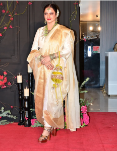 Rekha was wearing a white and golden saree with pants, a different draped saree style making her look very stylish for the reception event. Tabu was dressed in a sharara suit in mauve but had all big golden weave designs and embroidered gold dupatta.