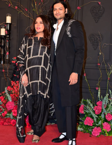 Richa Chada Wearing a Black and golden embroidery flared tunic with dhoti pants looked flawless as a mom to be at the event. Giving us some sophisticated kurta sets outfit ideas for Maternity outfit looks for a wedding event.