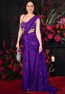 Even Sanjeeda’s Pre-draped saree outfit in purple and blingy statement look had to be one of the best dressed for a reception party. Her pick definitely says, sarees are In Trend for a longer time this season from brides to bridesmaids opting for sarees.