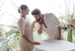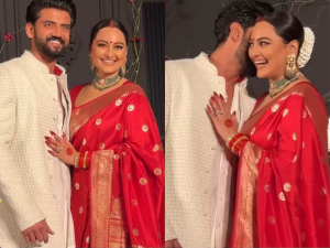 Sona creates the evergreen fashion of chikankari white saree to be a part of her civil marriage. She Styled it with a sleek bun with gajra which is a perfect hair do with sarees at weddings. Zaheer was seen in white thread embroidered kurta suit too.