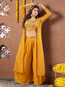 Indian wear with an extra edge with an additional style comes in with the Jacket or shrug style. These are add on fashion outfits that work best for extra oomph. Embellished jackets in mid length or short jackets are the new with zari, beads, zardosi patterns.